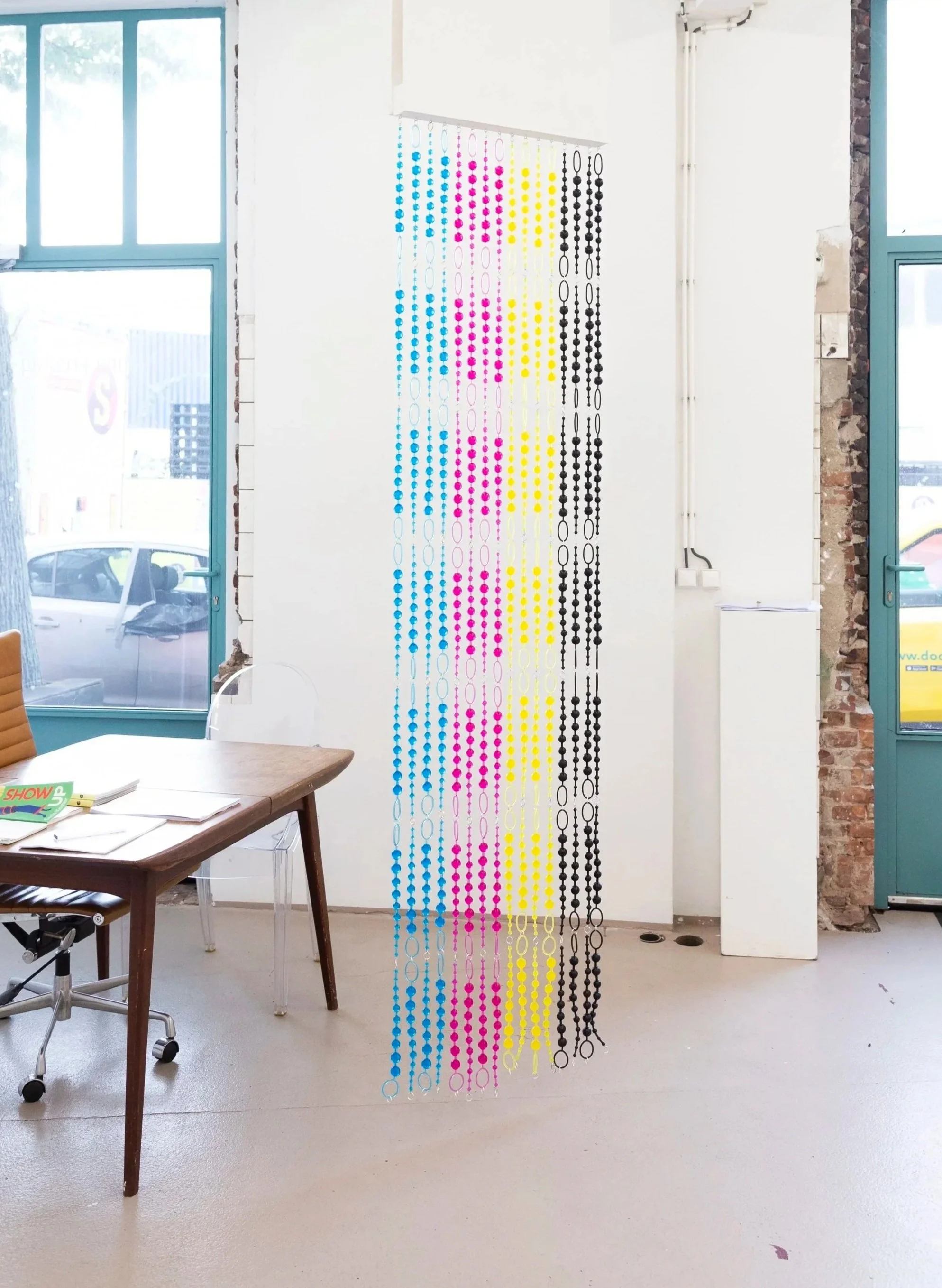 Joseph Hughes, String of Pearls, 2025, 112 anal beads, key rings, eye screws, 210 cm × 80 cm × 3 cm